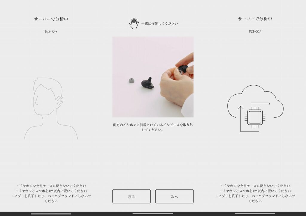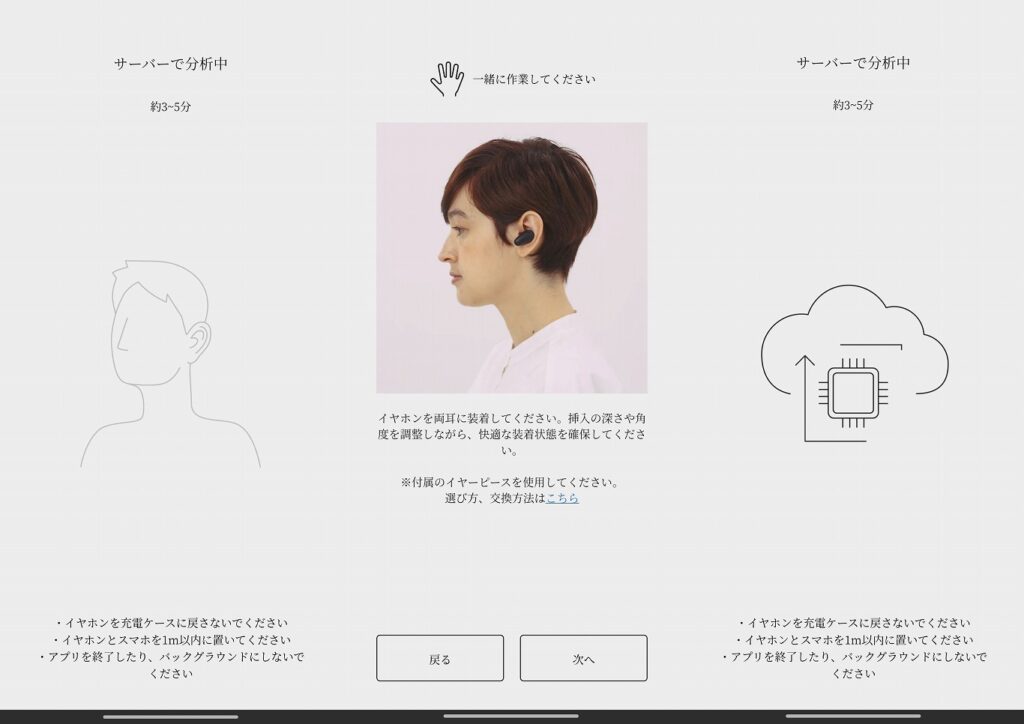 [スキャン終了後にサーバーサイドで計算が入るが1分弱で終了。次はイヤホンをはめて反響音チェックだ]