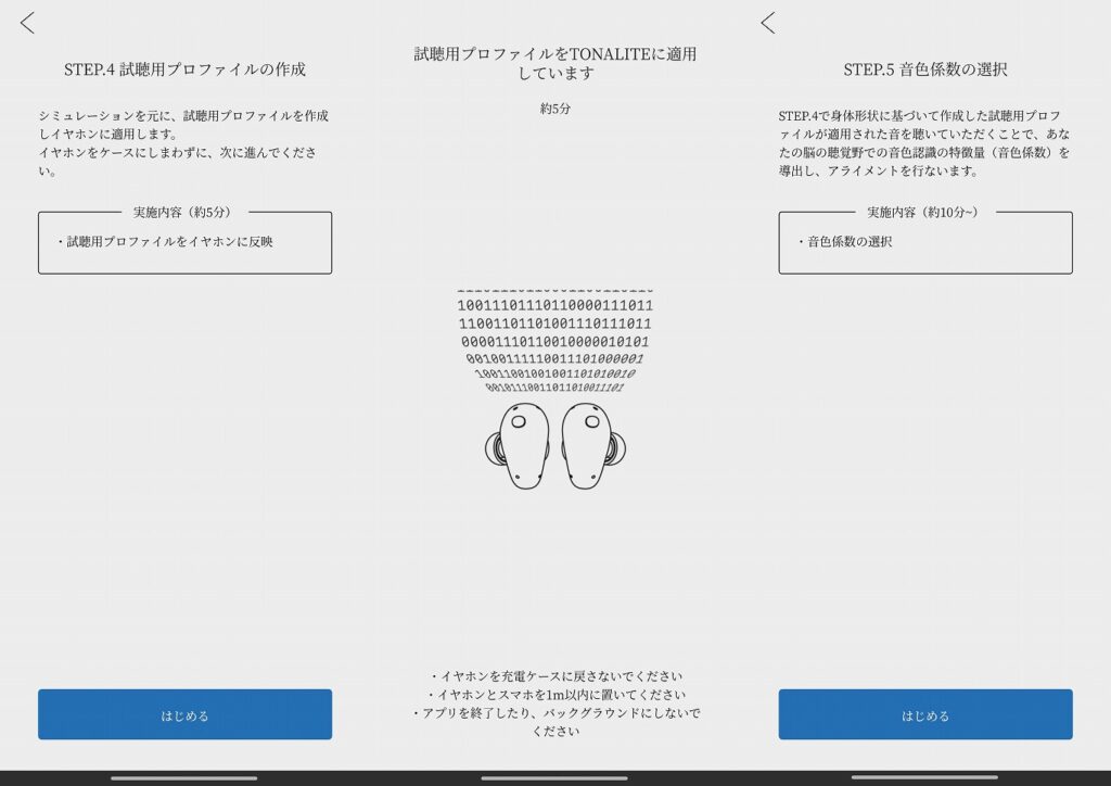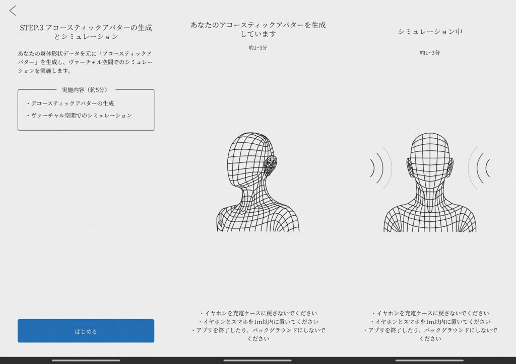 おおざっぱにプロセスを言うと、専用のアプリと個人のスマホを用いて頭や耳をスキャンし、それに基づいた仮設定の『音色』をプロファイリングして提供。それを個人が通常使っている音楽ソフトや良く聴いている音楽を流して、プロファイルが提示する『音色』で仮試聴し、多少の調整を経て最終的な『あなた特有の音色』をプロファイルとして設定するというものだ。