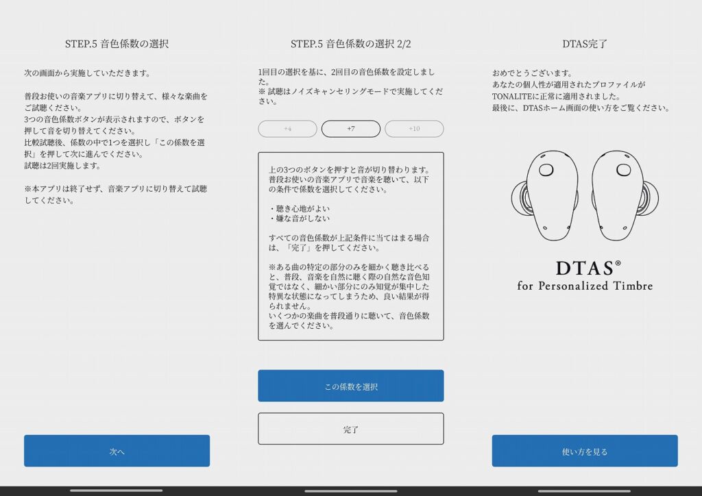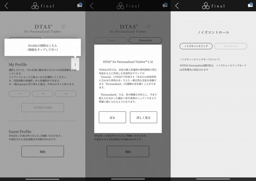 この個人専用の音色に対して3種類の『音質係数』をベースとしたプロファイルが用意されている。どれが良くてどれが悪い、どれが本物、ということは無く『コンテンツに応じていちばん心地よいものを選択してください』とのことだ。
