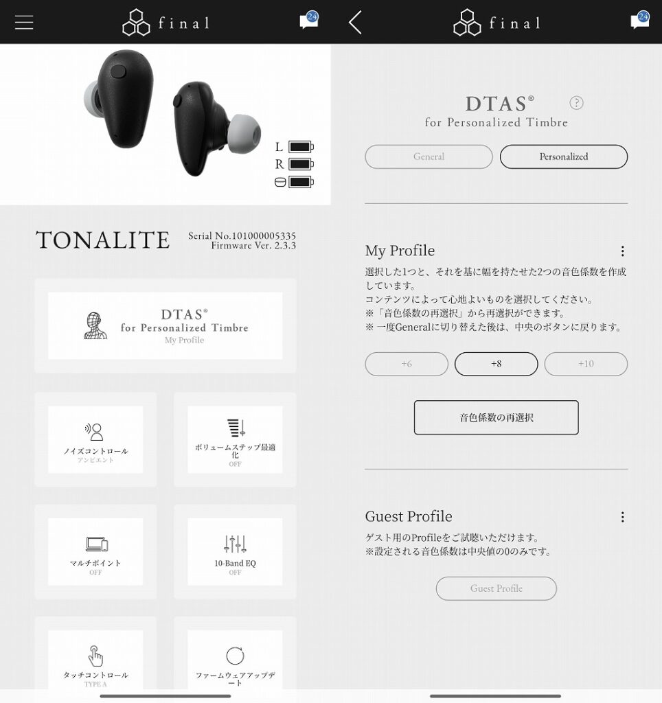 ま、20代の娘に試してもらったというだけで、こういった音響系に造詣は全くなく、イヤホンも聞こえればよいという程度の最近の若い子の感覚の持ち主であるので効果の程をあまり期待せずに試してもらった。TONALITE専用アプリには、メインユーザー以外にも”Guest Profile”として一つの”音色係数”(一種類のプロファイル)だけではあるもののこのDTASを試せるモードが付いている。上記画面を参照してほしい。