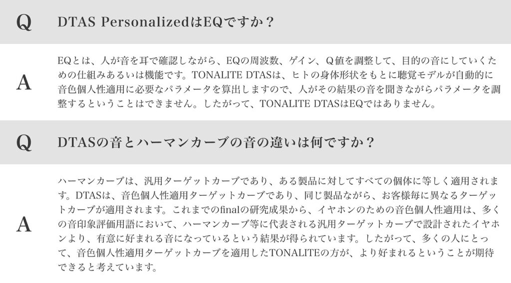 ということで、前編の続きとしてここから本機の目玉でもある、パーソナライゼーション技術『DTAS』を実際に試してみたので、それをご紹介しよう。そもそもDTASとはなんぞや?ということだが、finalの長年の研究の結果編み出した『ヒトが耳だけでなく、体で感じていた”音色”』を個人個人の特性に合わせてプロファイリングする技術のようだ。